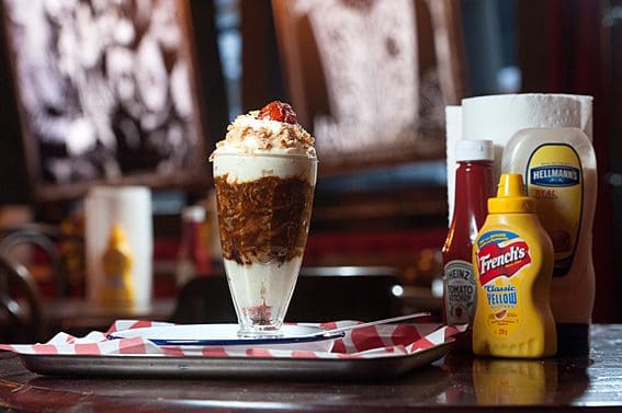 The end product is impressive, to say the least. Like a church gone bad, they have retained enough of the building’s original character to evoke that same sense of veneration one might have experienced in its former incarnation, but it’s warped, somehow, and gritty: tainted with that same sense of immoral excess that’s become synonymous with the brand. A perverse depiction of The Last Supper, resplendent in stained glass (and featuring hog ‘disciples’ and an owl ‘Jesus’ to boot) looms overhead, and the lighting is as dim and red-tinged as any backstreet Soho joint of ill repute.  There’s something pleasurably pulse-quickening about the whole affair, lying somewhere between the borderline-blashphemous décor, the unashamedly trashy soundtrack (Dolly Parton, Johnny Cash and the like) and the smiling, engaging ‘burgerettes.’ MEAT:mission isn’t taking itself too seriously, which makes it immediately more likeable than most of its try-hard neighbours.