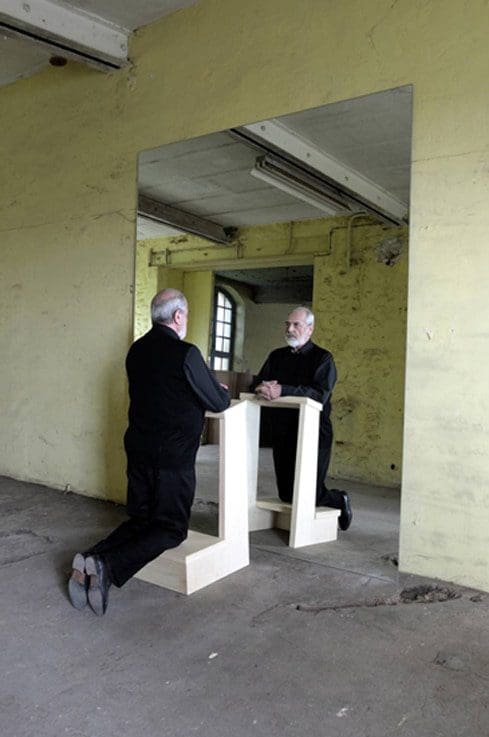 A statue facing a mirror (The Time of Judgement), a narrow gap in between it and the glass, provided an instinctive curiosity too natural to resist. Spectators hopped around it, attempting to view the anterior image as entirely as the posterior; to see what her left hand was doing when viewed from the right and vice versa. With Obelsik, a black wooden circle surrounded the peak. The segment blocked by the obelisk was recreated with the reflection of the opposing side. The over-arching structure made close-by visitors invisible as they crept into the blind spot of reflection. Passers-by who appeared to be within touching distance vanished from the eye line.