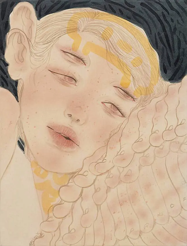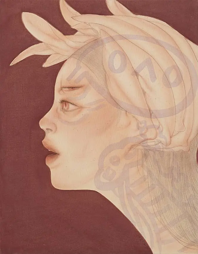 For her latest series of paintings, Kim draws inspiration not only from the visual language of online avatars and gaming but also from mythological tales and creatures, particularly the nine-tailed fox from East Asian folklore, renowned for its shape-shifting abilities. In Dysfunctional Night, the fox serves as the figure’s spirit or companion, its complex, multi-bodied form creating a whirlwind of color and motion, symbolizing a volatile, ever-changing state. At the center of the composition, the figure itself morphs between human, animal, and cyborg forms. Like all of Kim’s characters, this figure is androgynous with translucent skin, suggesting an existence that transcends gender and race. Yet, the faint outline of its spinal structure evokes human fragility and imperfection, grounding the fantastical in the reality of physicality.