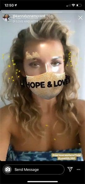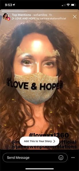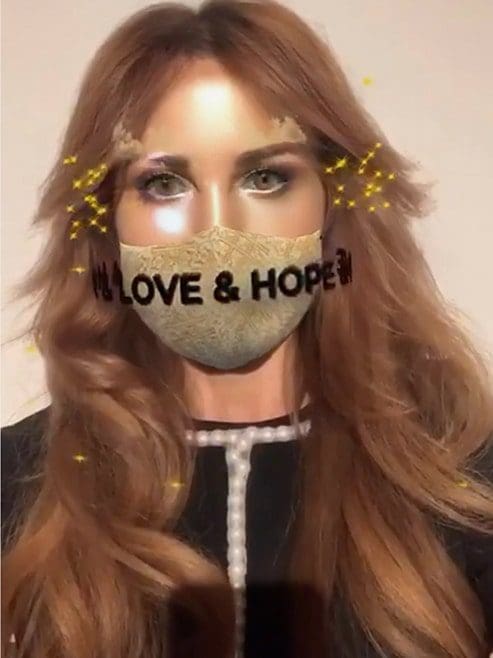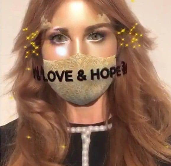 The filter is a gold medical mask with the words of affirmation “Love & Hope” surrounding the mask. Gorgeous geometric circles extend from the mask, and gold decorates one’s eyebrows and eyelashes. The filter is found under the name “LOVE AND HOPE” as well as her Instagram handle, @narinearakelianofficial.