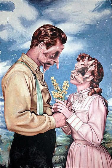 This is a world like no other: a world in which you can expect to be offered pills by a tripped out Mickey Mouse, in which you can expect to meet perverts, groping, freaks and repulsiveness; this is a place where an unrecognisable John Wayne lurks, his eyelids, nose and lips hanging like putty over his co-star’s face, a place where eyeless faces stretch and contort in tangled kisses, drooping and staring blankly at each other through flaps of bubblegum-coloured skin…