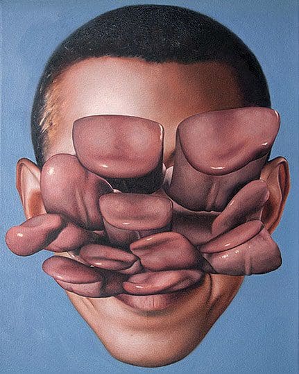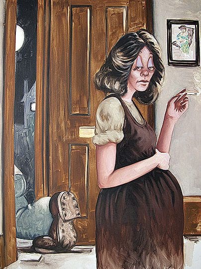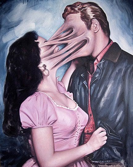Nathan’s work has changed a lot in the past couple of years. His earlier works were photo-realist paintings of collage-like pop images, bursting with pinks, lips and gloss. Now, however, colours are dimmer and the style is more painterly, expressive and aggressive. I ask whether he thinks his work is pessimistic and depressing and he laughs, saying jokingly, “Ha! Yes. I’ve tried to imagine the type of work that Eeyore would make and done that…!” He continues, “I think my new stuff is more personal. It deals more with themes of death, disappointment, co-dependence, jealousy… lots of the experiences that shape us as individuals. I thought it would be interesting to externalise the psychological trauma of the “sitter” onto their physiology. And 50s movie posters were perfect. They tap into that nostalgia for a lost golden age which, when turned on its head, adds another layer of subversion.’