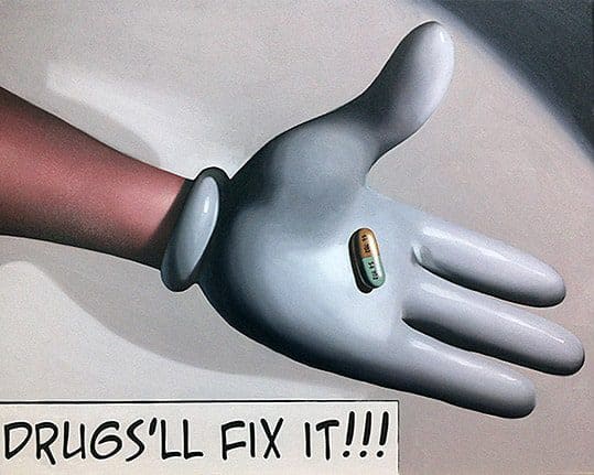 “I think it’s about trying to look at what’s really going on…” says Nathan James, talking about a painting where Mickey Mouse exclaims “Drugs’ll Fix It!” whilst handing out a pill. “I’m interested in the stripped down underbelly of our culture. Like it’s closing-time at a sleazy nightclub; all the lights have come on and you’re forced to take a stark look at what you’ve been dancing with all night… a pharmaceutical advertisement broken down to its barest essentials. A spot lit, trusted hand holds out a magic pill that will wipe away whatever ails you. It promises a pharmaceutical solution to spiritual problems…”