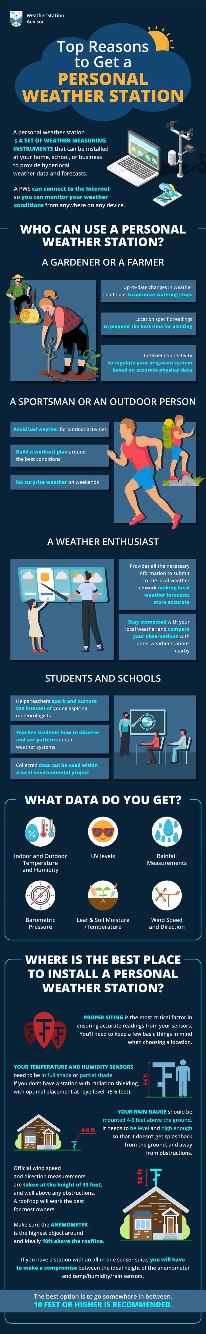 If you are tired of inaccurate forecasts and plans ruined by the rain, think about buying your perfect personal weather station. In the infographic below, you can check how to install your station property and read about the requirements you have to fulfill before you make a decision.