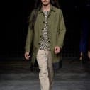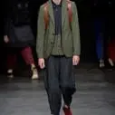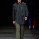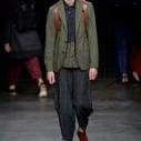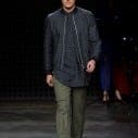 Styled to be partially buttoned or zipped up along with unpressed thick cotton jackets and up turned collars, Oliver Spencer formed much of his influence for his collection from the sculptor Richard Serra who is widely recognised for his assembly of sheets of metal in arcs, eclipses and spirals. This is evident is the lines and cut of the clothes, such as the wilton style collar of a jacket and the striped print of another.