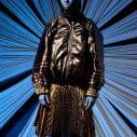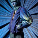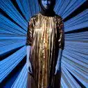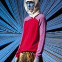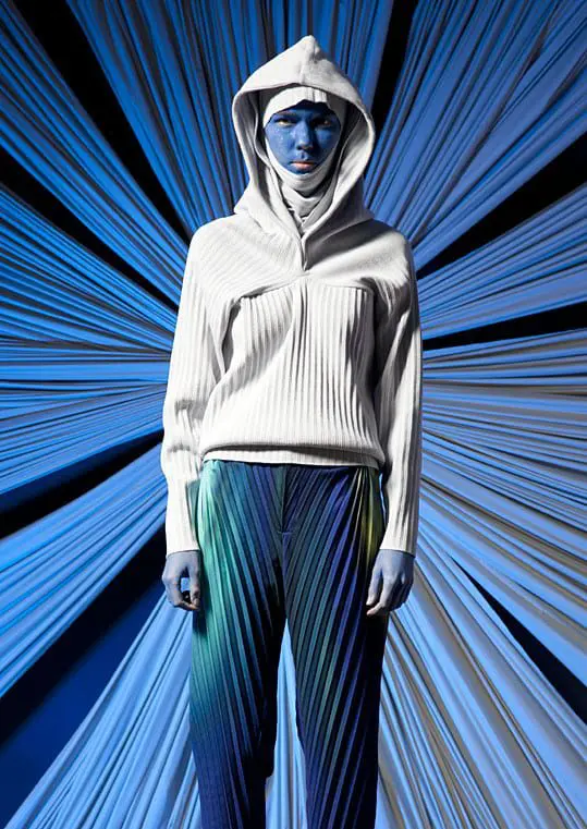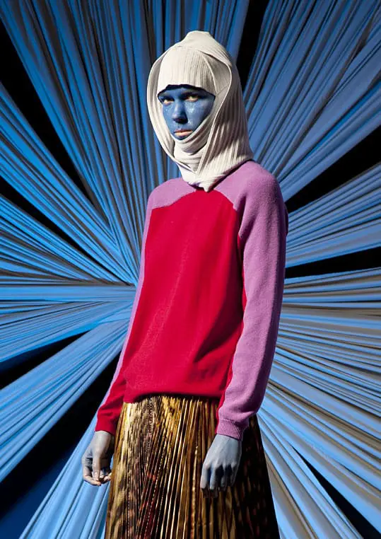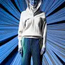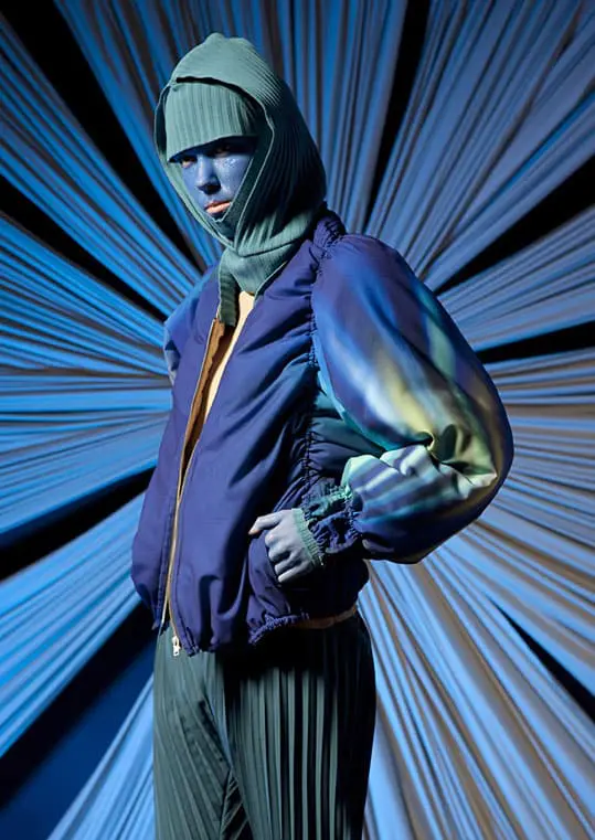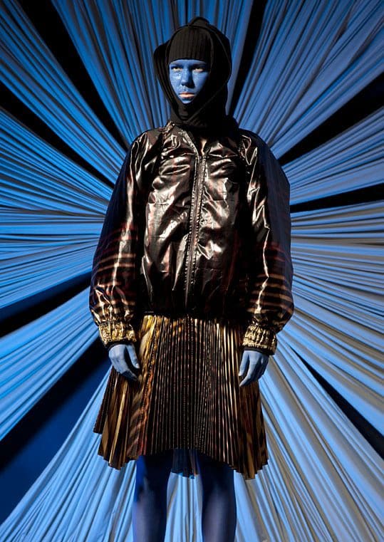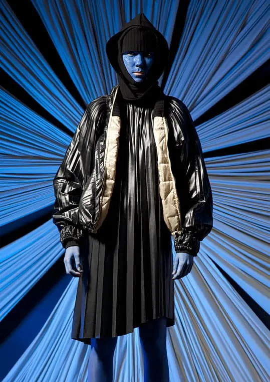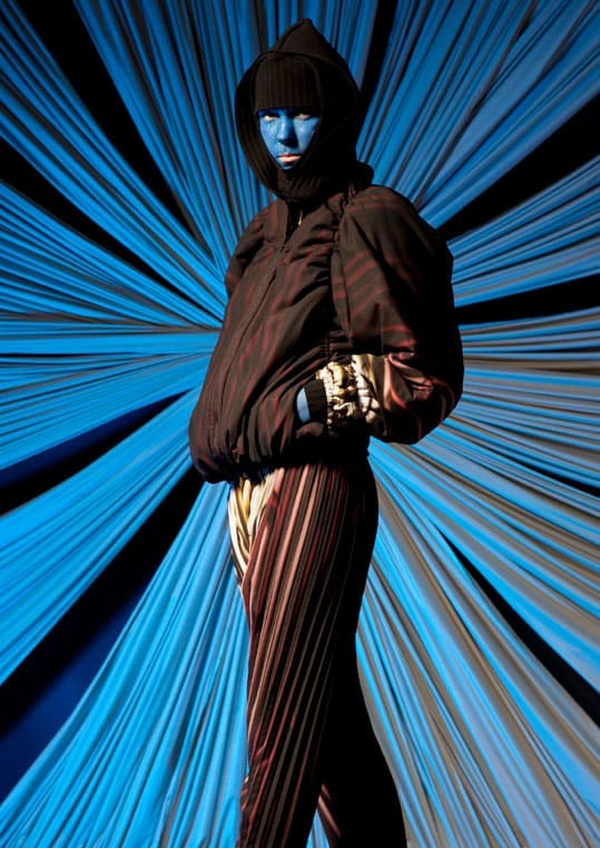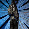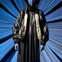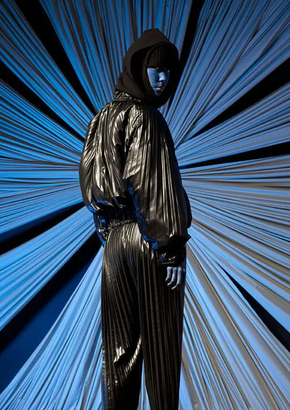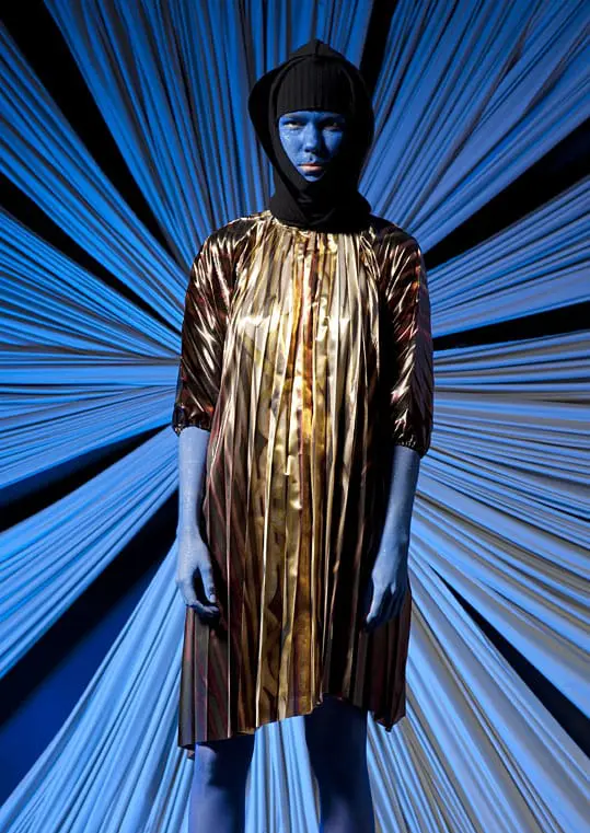 “Somewhere set in unknown territory, south of Vegas, the collection envisions ideas of light. Neons, light beams and reflections on metallics, gold and silver, shape arches and create an overall enlightened architectural structure. The sun ray pleated skirts, pants and dresses have a laser cut hemline that enables freeform curves and a precise definition of pleating. On the padded bomber jackets the pleats sculpt around the shoulder and spread the reflections rhizomatically.”