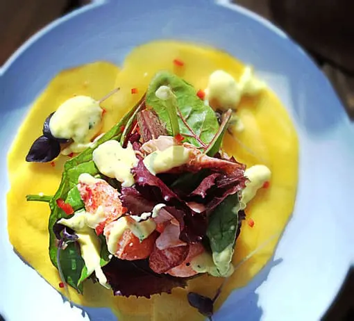 After a brief swabbing of the table from the deckhands, the third course is brought forth. A towering pile of rope-grown mussels, doused in a fiery, bloody mary sauce with a hunk of golden, crusty bread. Perfectly tender, they lack the rubbery texture that often characterises a poorly cooked mollusc, giving just enough resistance that sinking your teeth into them felt like a triumph. The supplied sauce is good enough that I mop up every last drop.