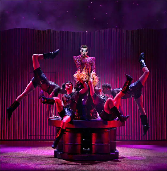 An amazingly visual moment is Felicia’s operatic performance on the top of the bus as it drives through an outback storm, looking like an actual angel in white with feathers and enormous hoop skirt. In fact we loved the pure sass of Felicia in this show. And we loved the other trio of divas, Claudia Kariuki, Aiesha Pease and Rosie Glossop, also angelic in sparkling white – providing the opportunity for the drag queens to lip-sync for their lives to 70s and 80s floor-filling anthems!