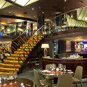 Certainly it looks the part. Stroll down the enormous flared staircase and witness the majesty of the glistening curved bar, shining gold and draped with – weirdly – artificial plants. With a tidy little stage at the front, it’s almost like an old-fashioned ballroom, but there’s a darker edge of late twentieth-century indulgence which gives the place a Brett Easton Ellis feel. Maybe it’s the DJ booth, with its insinuation that dining out must be accompanied with a professional DJ curating your meal’s soundtrack. Maybe it’s the abstract art placed high on the walls, bringing to mind both Alexander McQueen and, somehow, the Rocky Horror Show. Or maybe it’s the porticoed glass ceiling, reminiscent of some Bauhaus-era Mitteleuropean train station. Either way, it works: despite the enormity of the dining room, it manages to retain an intimacy, a cosy informality, a kind of convivial charm which makes eating here feel far more informal than it might sound. Credit to the waiting staff, whose unfailing friendliness spreads the easy-going vibe.