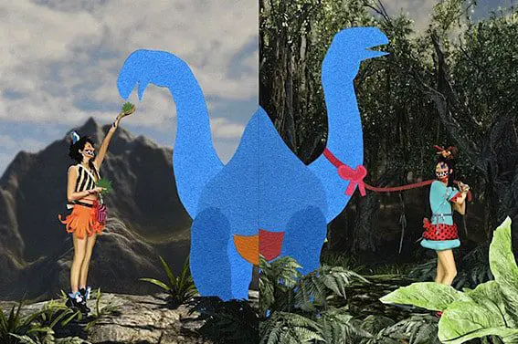 This latest show ‘Cretaceous Returns’ is incredibly their debut UK solo show. Cardboard dinosaur sculptures move and interact with photographed humans – all set against a lush jungle backdrop.