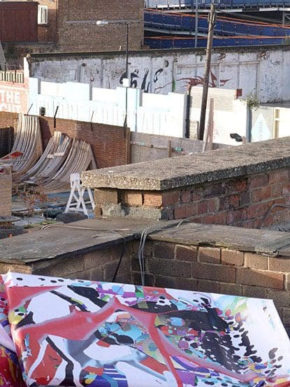 C: The location of the gallery on the fifth floor offered us the opportunity to observe the area from above and thus has functioned as an important source of inspiration. By painting the mural in the car park opposite, or attaching a banner with one of his paintings on a rooftop opposite to the gallery window, Riccardo bridged a gap between the inside and the outside.
