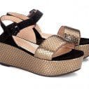 The Robert Clergerie collection for Spring Summer 2014 continues with the brand’s signature masculine-feminine interplay and attention to detail. Look out for the 1970s disco vibe in the metallic and glittered leathers and wooden and sequin heels used for the stunning statement shoes. Brogues and loafers are given a futuristic makeover with metallic panelling and surface studs; and there are coloured raffia styles that are just perfect for summer.