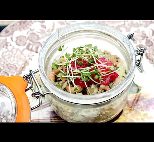 Upon our mid-afternoon arrival we are equipped with a bespoke cocktail and left to mingle with the other guests or lounge about blanket-strewn sofas whilst genteel folk music fills the air of this industrial space. A working yard during the week, Dram and Smoke arrive at 5 o’clock on a Friday evening to create a venue in which taxidermy jostles with steel rods for space. It is at once elegant and offbeat. Half an hour later we are seated, awaiting our first course of Haggis bon-bons and chilli jam. For a first time experience we were both pleasantly surprised at the mellow flavour, accompanied perfectly by the sharp heat of the jam. With no-one brave enough to ask the exact contents, we conjure our own gory suggestions.