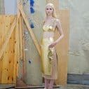 This is a fun and wearable collection featuring soft-meets-harsh materials – plastic looking fabrics sit against mesh knits, chiffon and silk, gold and creams.