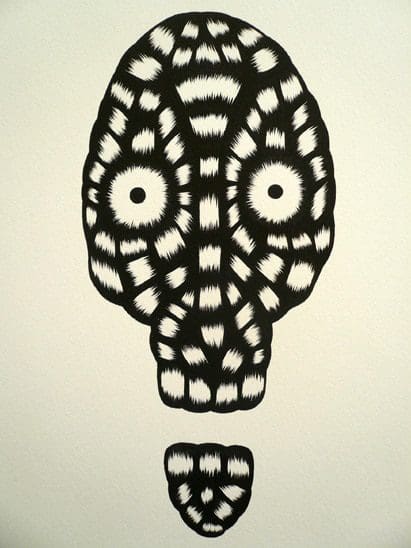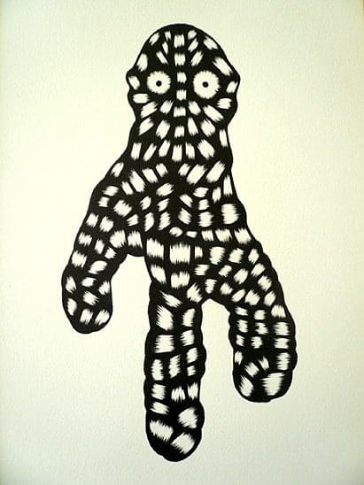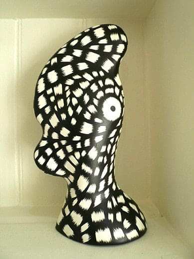 His illustrations are controlled and uniform even though they are surreal in so many ways. Some are clearly inspired by anatomy with body parts in colour but the majority take a while to understand. Not that you have to understand them. Seeing the pieces together you can see they are creatures with eyes and teeth – one sculpture he calls a sheep.