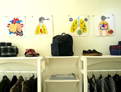 The prints and sketches of creatures in black and white also incorporate their frames and mounts to give impact to the pieces rather than just displaying them. The collaboration is interesting. A repetition of this trademark black and white (creature) print with what can be described as small green greyhounds printed all over. I’m told it’s not even available in Japan and this pull of limited edition instantly makes me want to buy something, anything.