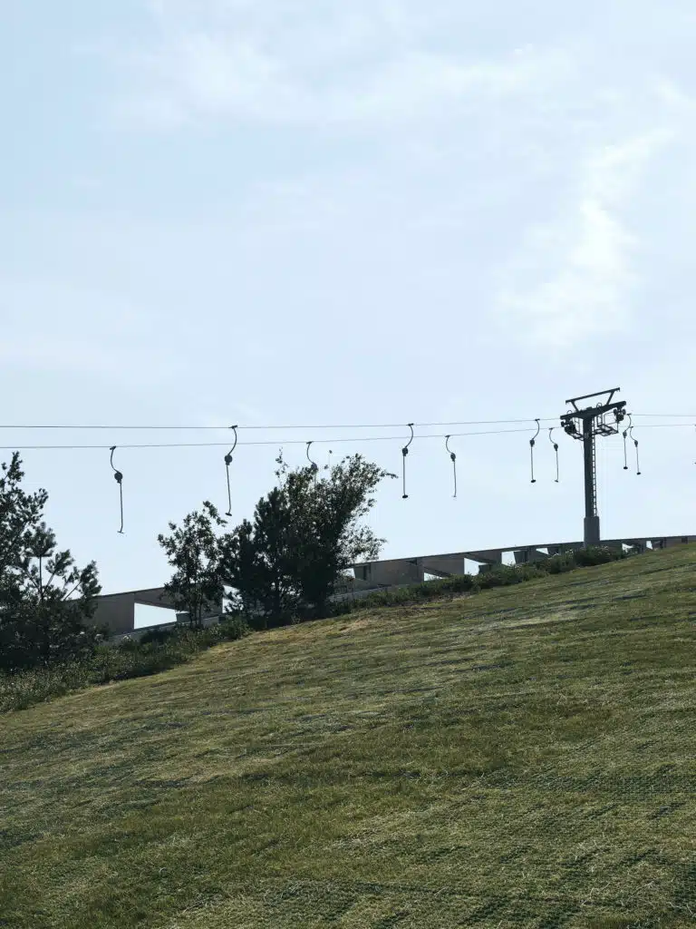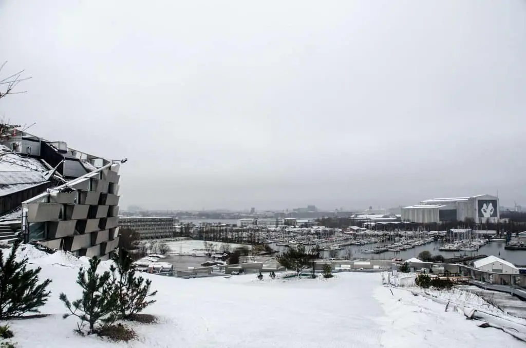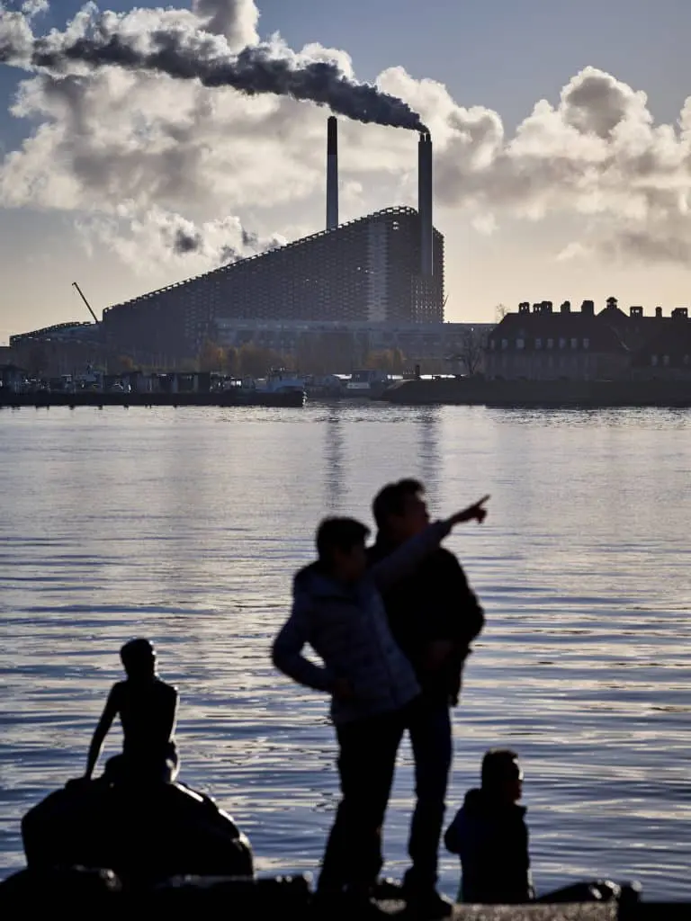 The green-blue slope snakes sharply downwards, resembling a cartoon frozen river. The views are edge-of-the-world, if that edge was a forgotten-feeling industrial area of Copenhagen skirted by iron-blue sea. This is Copenhagen’s new ski slope.