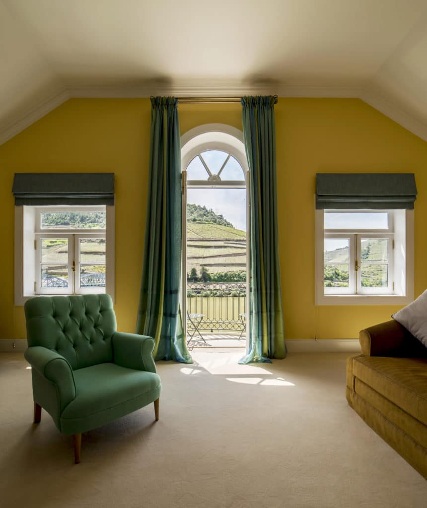The sparkling waters lead the boat towards Piñhao, where The Vintage House (one of the few exclusive hotels in the Douro owned by The Fladgate Partnership) rests on the tranquil water’s edge. At the riverfront entrance, a whimsical pergola leads into me into a colonial style bar called The Library, where deep-buttoned leather sofas and classical cabinets sit beneath the majestic beamed ceilings. Along the corridor, I also spy beautiful hand-painted murals of grape harvest scenes in the ambient Rabelo Restaurant. Elegantly appointed suites overlook the spectacular bend of the river. The water’s omnipresence has a soothing effect; it’s the kind of place I’d imagine authors to be writing their next novel.