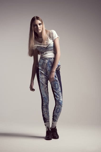Body by LUCY SHARROCK, trousers by ANNA MOUTAFIS, socks by WOLFORD, trainers by UMBRO, head scarf Stylist’s own, earrings made by stylist