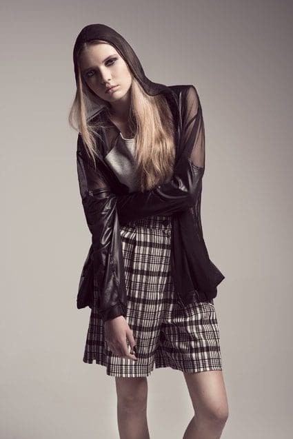 mesh hoody by ANNA MOUTAFIS, sequin dress by ANNA MOUTAFIS, boots Stylist’s own