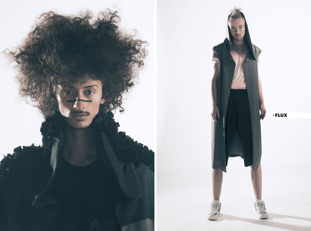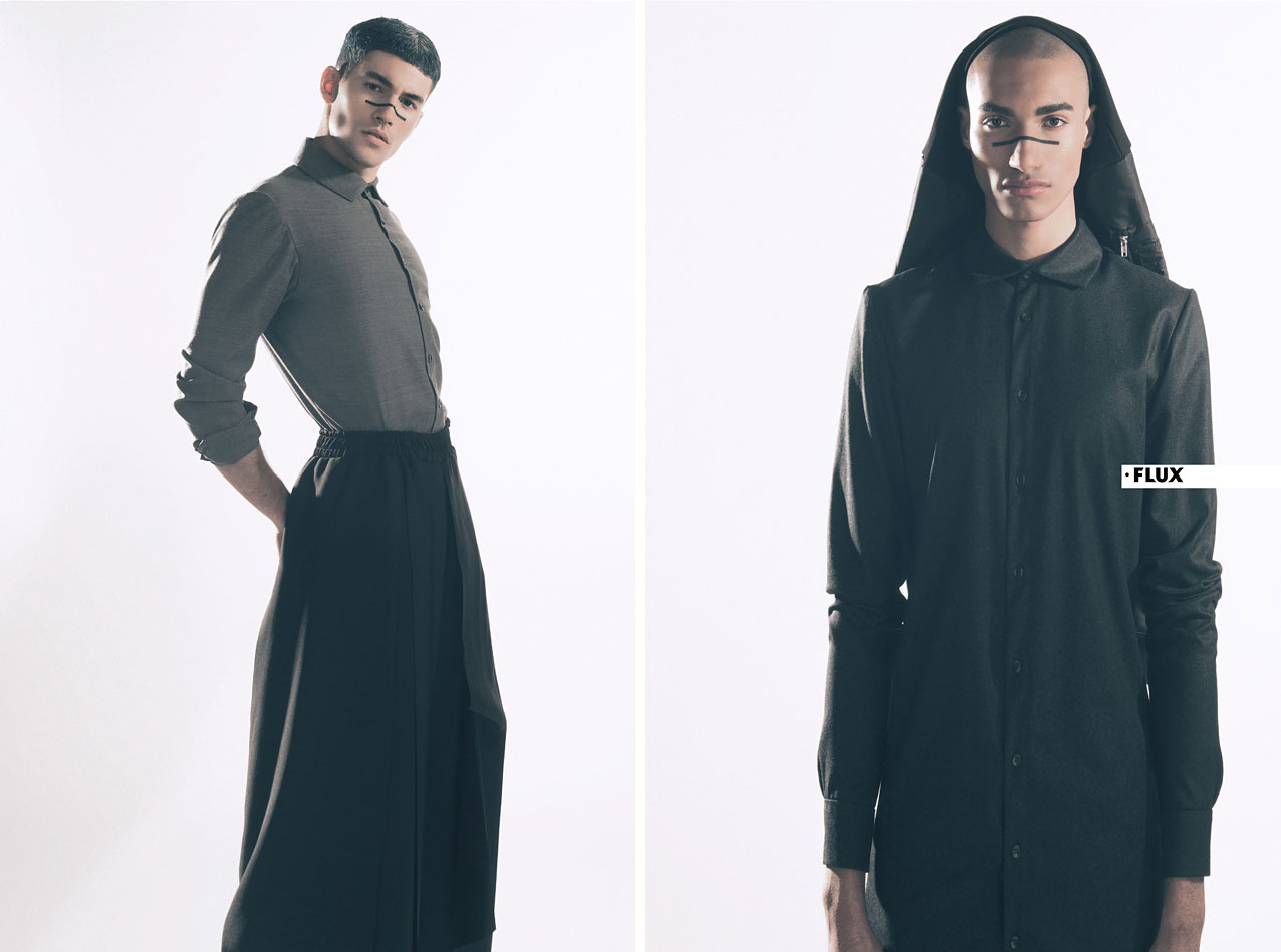 - LEFT: PEDRO wears grey jersey shirt by Merel Weijgers, black oversized shorts by Tamara van Klooster. RIGHT: JOEL wears dark grey longline shirt by Merel Weijgers, black nylon sleeve sweatshirt with zipper by River Island
