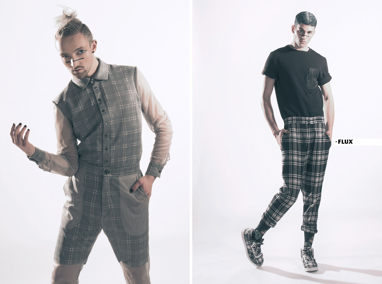 - LEFT: NICO wears grey mesh shirt and trousers with check print by Merel Weijgers. RIGHT: PEDRO wears black short sleeve sweatshirt with zipper River Island, black and white check trousers and sneakers by Merel Weijgers, black socks with skull print by Topman.