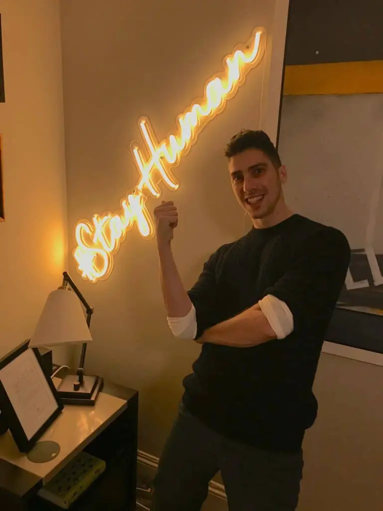 There’s a middle-aged man next to me. In the spirit of Stay Human, I decide to break the ice.