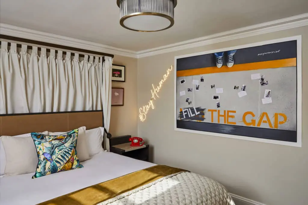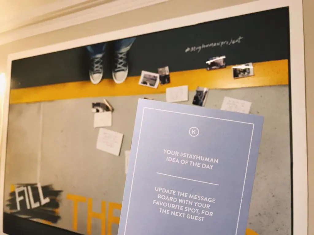 At the Fitzroy, the #StayHuman room is dominated by a huge ‘Fill the Gap’ message board. Inverting London’s infamous ‘Mind the Gap’ safety message, we’re asked to help fill the space on the board with photos, notes and messages, slowly making the room feel more personal.