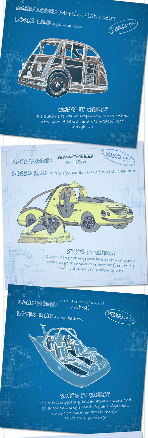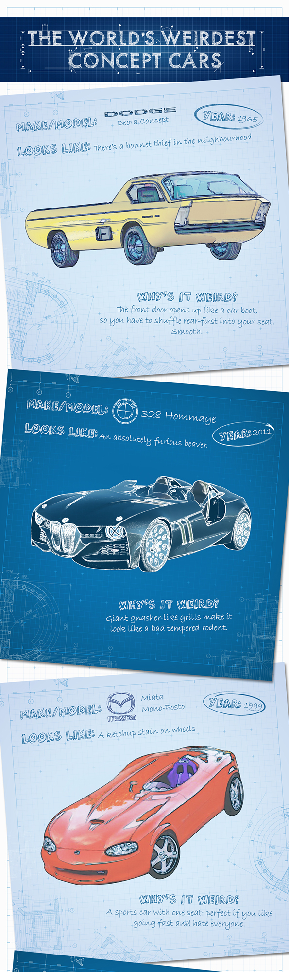 With stiff competition every year to produce thrilling new concept cars, it will come as no surprise that designers occasionally succumb to the pressure, go a bit loopy, and end up proudly presenting their gleaming new design to a chorus of laughter.