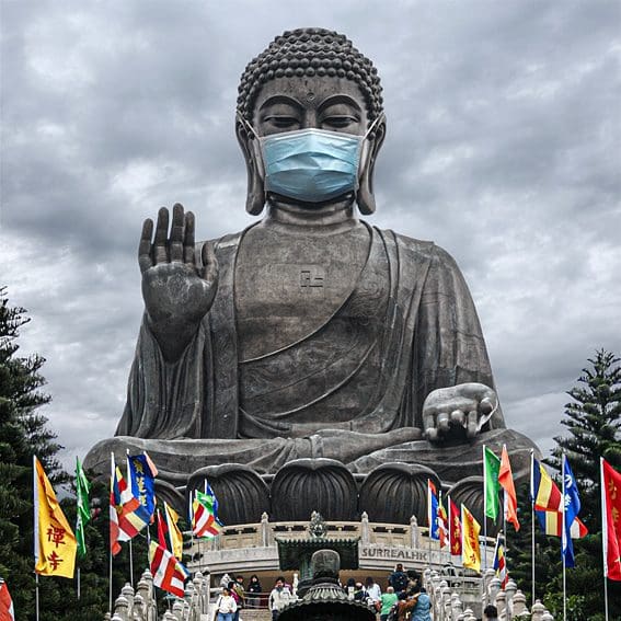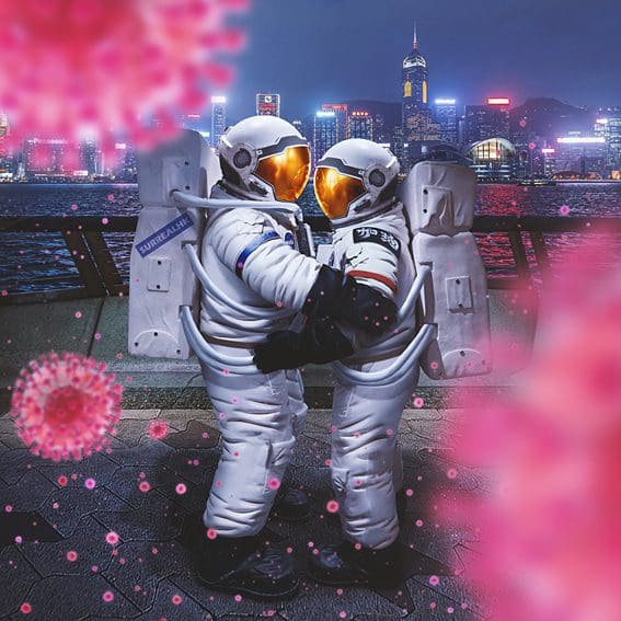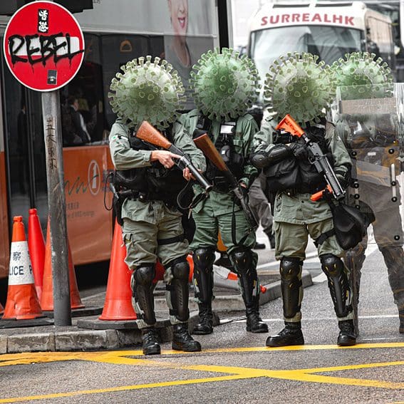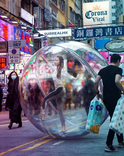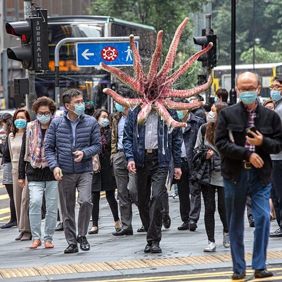 The surreality of the situation has been astutely captured by Hong Kong-based surrealist artist, Tommy Fung, who has created a series of Coronavirus-inspired artwork on his Instagram. Featuring citizens in protective hamster balls, stampedes of people chasing the elusive protective facemask and motorbike-riding police officers with coronavirus particles in place of faces, Tommy is using his art to speak up about the virus and the effect it is having on the city and its community. “All my artworks are about daily life in Hong Kong,” he tells me, “so when this pandemic began my sources of inspiration were the news, the government’s response and people’s reactions.”