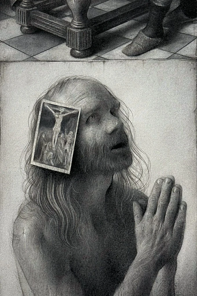The drawings are made with great technical skill and control, but their subjects are often disturbing. Malling shifts easily between careful portraiture and scenes of violence or unease. In Torje, a finely drawn male figure appears both confident and exposed, suggesting a quiet reflection on modern masculinity. Elsewhere, impaled animals and strange hybrid creatures introduce a darker mood, unsettling the calm precision of the drawing.