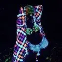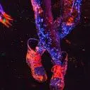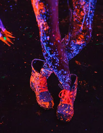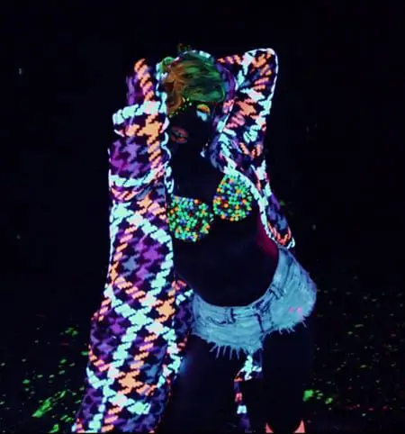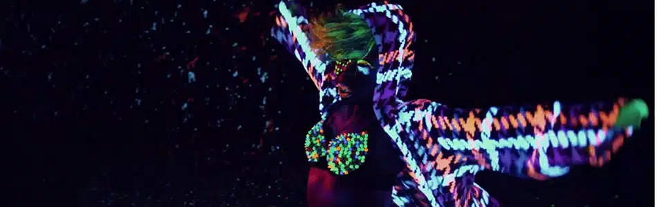 The dazzling visual effect was achieved using neon paint filmed against a backdrop of black light. The figures literally jump out of the screen and grab you by the eyeballs.