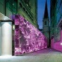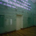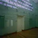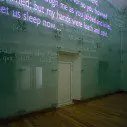 There are other forces and interests at play here, however, that relate back to the artist’s interest in language. He describes the works as ‘book ends without the books’, and notes that they speak of the non-space that we inhabit in between the escapist displacement of the watching of a film and finding our feet in the outside world. Once again we find ourselves in a space of inbetween-ness, a state mirrored by the canvases themselves, which hover, as David Campany has noted, between canvas and screen. The feeling of linguistic disconnection Patterson likes to play with is also echoed by the glow of the letters, suggesting a bad transfer or that the projection is slightly out of sync.