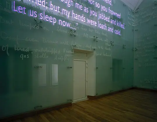 We’re here to discuss The Dark Would exhibition also an anthology of poetry and text art created by curator and artist Philip Davenport, in which two paintings from Patterson’s Black List series appear. Patterson’s work features in both, so I ask him if has a long standing interest in poetry? This leads to the question of the intermediary space between the established disciplines of art and poetry which both exhibition and anthology inhabit. Davenport describes the artists and poets involved in the project as ‘people for whom language is itself a state of in-between-ness… artists who use language and poets who are artists’. Patterson certainly identifies with this notion: ‘the work I like the most is often almost not art…its approaching something else altogether…I like work which is on the brink of failure, on the brink of becoming something else. My own work can be on the brink of being graphic design [he pauses]. It’s where something is close to being something else or to falling apart. One reason I like that kind of work is that it’s a way in. When something is seamless it’s hard…’