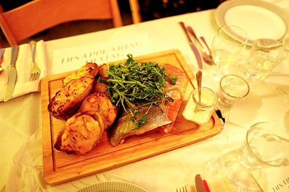 On arrival we sip ‘Grey Goose Le Fizz’ cocktails and puzzle over the event design: a disco ball spins coloured lights across a projection reading The Disappearing Dining Club whilst generic DJ music thumps in the background. Everyone is well-dressed, awkwardly eyeing up their fellow guests. We try to avoid the pre-dining small-talk and instead munch on the canapes of asparagus with creamy ‘sauce mussoline’, mackerel tartare and chicken liver crostini (which are definitely on the tooth-cracking side of crunchy).