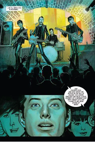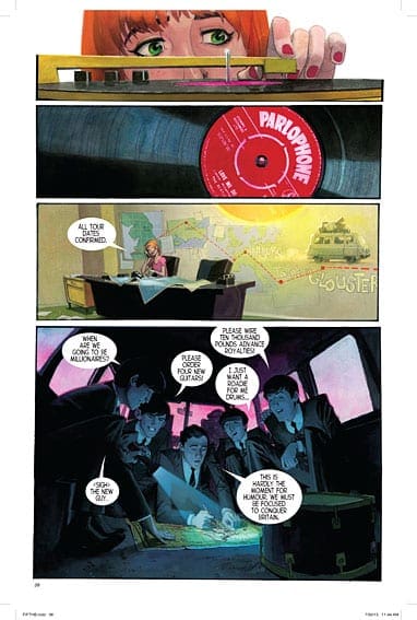 Vivek J. Tiwary: When I first thought about telling the Brian Epstein story, the story came to me in terms of colour palette. It starts in Liverpool in 1961, which is very dark, industrial, rainy and grey. I thought of it as very black and white. It ends in London in 1967 London, which is the birth of the summer of love, the birth of the psychedelic era, and that era is very Technicolor. But I thought of the story as the movement from black and white to Technicolor, and when you think of it in such visual terms that to me was a graphic novel and a film. Those are the two most visual of the artistic medium, and so we actually set about developing both. From the very beginning it was our intention to make both, but for a number of reasons the graphic novel took on a life of its own, but finding these two amazing artists meant we were off to the races.