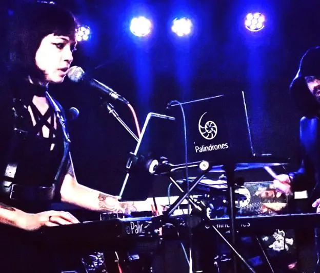Next up was Palindrones aSouth-East London based multi-instrumental Techtronica, Synth Drone duo. As they started their set, the evening continued to pick up speed and turned into a club-music scene like atmosphere, partially accompanied by a punk-like blistering sound.  Their stage presence was somehow static and graceful. The show of the two is exactly how you would imagine techno monks on stage, when the machines took over the world, he bangs on the electro-drum set, and she sings with a voice: which reminded me of Polarkreis 18’ song Allein, Allein”: while you are preparing yourself through celebration for the uprising.
