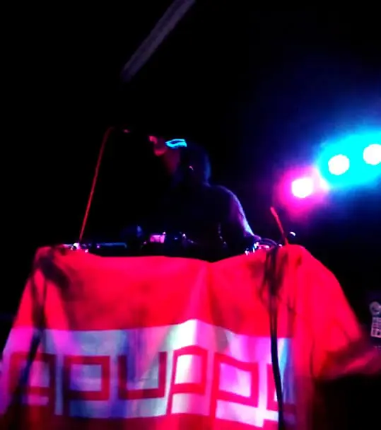 What a great night so far. Despite the diversity in the musical performance of the various acts, everything seemed to have some kind of logical sequence which dissolved in electronic madness called Leg Puppy an electro psych multimedia outfit which presented themselves with two members. While one (kind of henchmen) dressed in a black leather coat and a plague mask just stood there took the other; ( the singer) dressed with a in neon colours glowing mask; the loop machine over and opened the show with a triangle and  wobbly electro chants from the off. The sound was driven by techno beats and raving performed like a school class on xtc, peppered with cheeky and snotty lyrics.