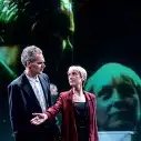 And it’s within this framework that we witness the play’s skilful modernising, its felicitous fusion of past and present: murder weapons used as evidence in a court case are no longer exhibits ‘A’ and ‘B’, but exhibits ‘Alpha’ and ‘Beta’; a haunting, twentieth-century pop song is incorporated, accentuating one of the play’s darker themes; TV cameras transmit political news onto a big screen, helping the political dimension of the play feel as important and relevant for us as it did for the Greeks; murders are accompanied by clinically precise times of death, which will then be neatly woven into the protagonist’s public trial; and the war that is being fought by the state could be against other Greeks, against Persians, or against latter-day terrorism.