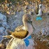 On dry land the wildlife on North Seymour is equally as exuberant. It’s the mating season for magnificent frigatebirds. The males are perched in skeletal incense trees are puffing out their vermilion throat sacs and filling the air with strange warbling ululations. Down on the ground male blue footed boobies are also in full courtship mode and as we walk past their sandy nests they lift up their sky blue feet and stare at us fearlessly with piercing aquamarine eyes.