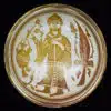 - C.49-1952 Bowl; earthenware, with Coptic Priest & Kufic inscription; said to have been found at Luxor; top view; black background; Egyptian (Fatimid); Early 12th century.