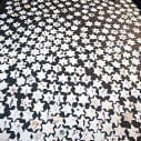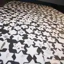 Titled “A Star Shall Stride” the piece is comprised of hundreds of porcelain stars fired in a gas kiln, individual Stars of David, each one unique, and placed upon an elongated black background, creating a large plume, speckled with golden stars, stretching towards heaven. The work is, in its own way, a personal, secular, Kaddish, one of the stars bearing the Auschwitz camp identity number which once belonged to Rosenzweig’s grandmother.