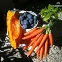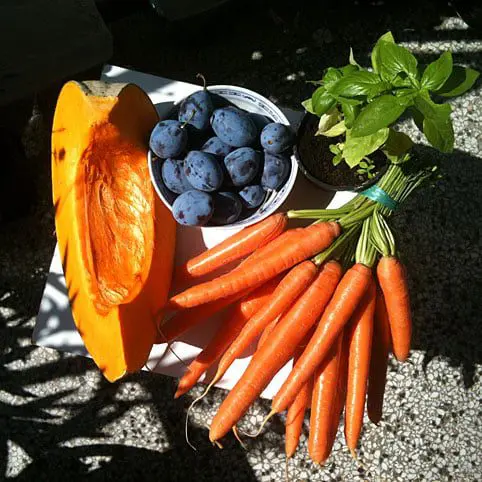 The season begins with raspberries, plums, blackberries, peaches, cherries, sour cherries , and expensive early sweetcorn, and now, as I’m leaving, goes into squash, aubergine, grapes, beetroot, and the last of the sweetcorn, expensive again – a spectrum of autumn colours.