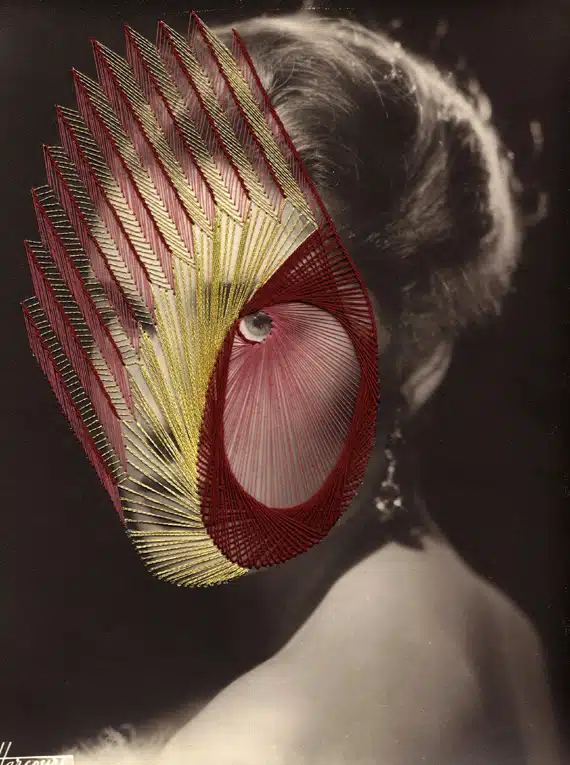 Anzeri’s ‘string art’ technique of overlaying geometric, threaded patterns to recast the photographs into an alien form, reinvents examples of formal, photographic portraiture. The results are often unsettling on the viewer as the images seem to reference futuristic images of cyborgs and androids as well as ancient masking techniques.