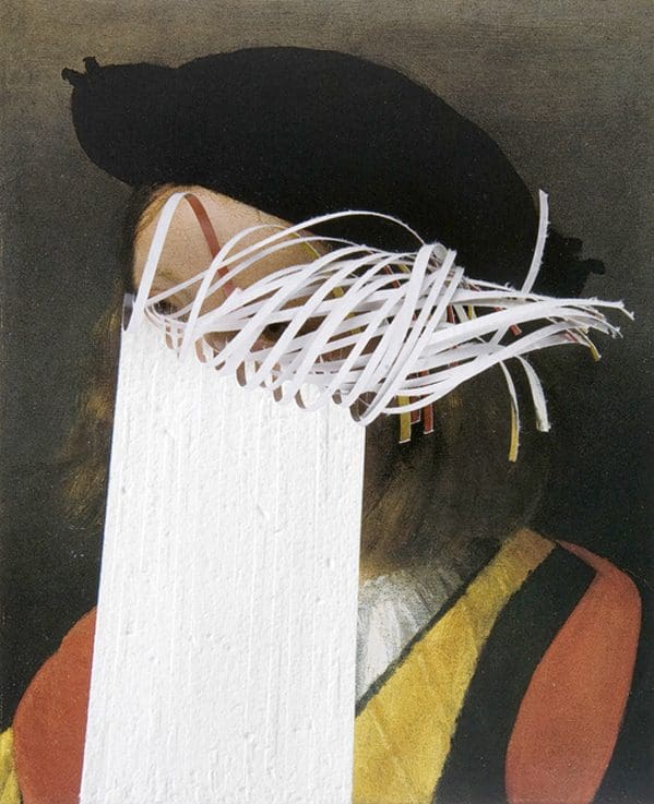 Claxton works with postcards of portrait and figurative paintings to create hybrid objects. She draws our attention away from the pictorial interest of the portraiture and focuses the viewer’s attention on the semantic and material structure of the work. The works intensify the language of the traditional pictorial interest and intensifies the images through an amalgamation of painterly, sculptural and photographic techniques.