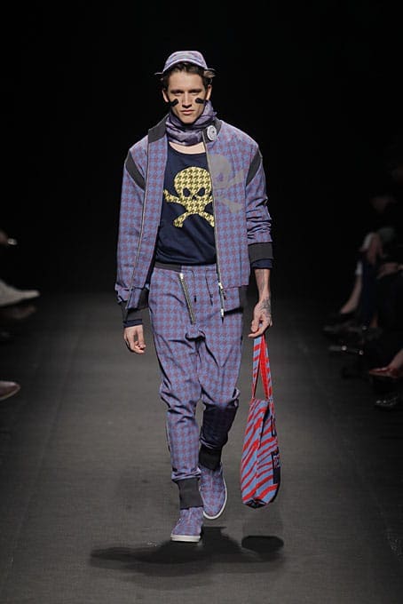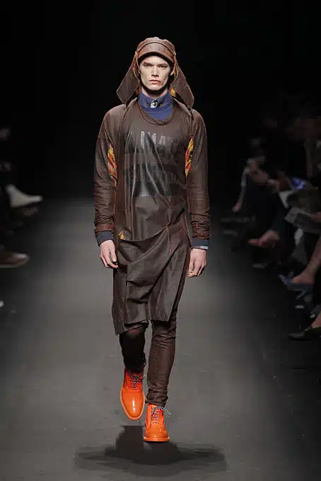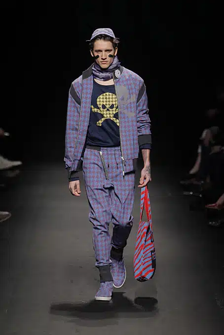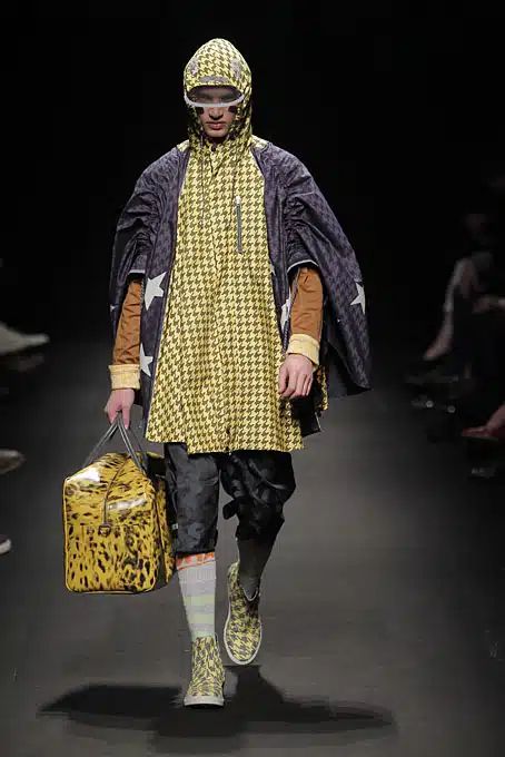 The models’ ‘up yours’ attitude was shown down the catwalk (much like Westwood’s own) presenting a story running from smart tailoring, with aspects of metallic lurex knitwear, through to the nylon weather-proof pieces. Then we moved into the more unconventional pieces such as bright, over sized tartans and evening styles in fine wool fabrics mixed with leopard knits featuring large turtle necks.