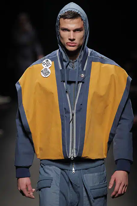 Could this be to suggest the order of wear throughout the day? From the workplace, to the commute home and finally on to the evening’s antics? Whichever order you were to choose, the underlying message about climate change is one that Westwood challenges you to examine harder, to re-think your everyday acts.
