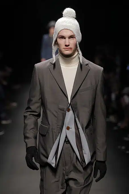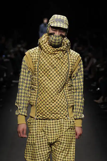 We saw high-vis detailing inside of reversible pockets and seams and also incorporated into exaggerated dog-tooth check. Many cyclist features were noted in the designs, such as sun visors built into the hoods of brightly coloured wind breakers and trousers tucked into socks so not to catch their large scale tartan suiting in the suggested bike chain.