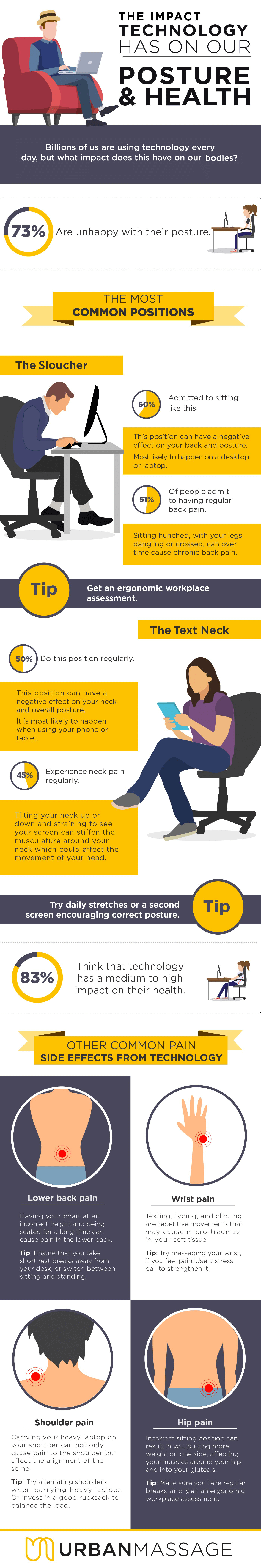 To conclude, the data demonstrates just how ingrained technology is in all our lives – and how damaging that can be for our bodies. There’s also some great tips on how to improve posture while sitting.