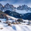 Above the rooftops of Ortesei we catch tantalizing glimpses of the snow capped Dolomites and after lunch Aron suggests taking a cable car up to the skiing pistes for a late afternoon stroll. It’s a great idea and when we walk out of the cable car station, I’m blown away by the magnificent view. At the far end of an undulating plateau of verdant pastures, a range of limestone mountains swoops upwards, its crest fractured into dozens of icy fingers sparkling in the winter sunshine.